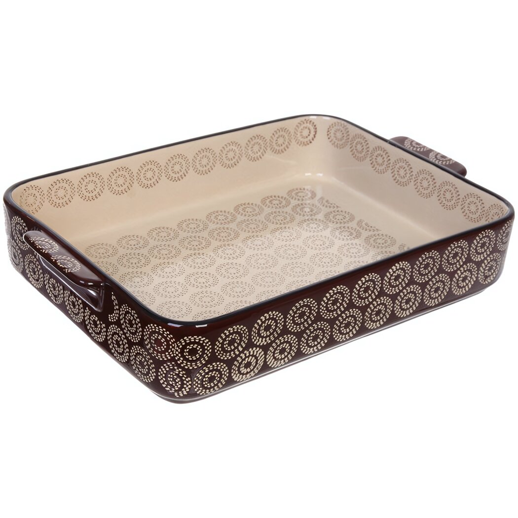 Форма выполнена в темно-коричневом цвете с светлым бежевым внутренним покрытием и украшена узорами в виде завитков. Она идеально подходит для запекания мяса, овощей, а также для приготовления запеканок и десертов. Не забывайте, что форма не предназначена для использования на газовых конфорках и открытом огне, а также на электрических и индукционных плитах.