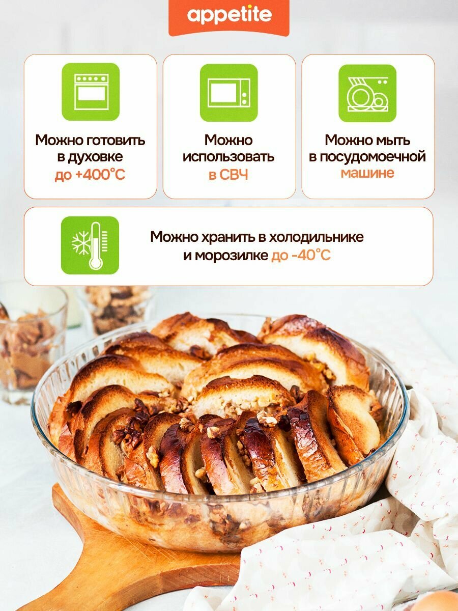 жаропрочное стекло, безопасность и долговечность, удобный объем 2.1 литра, совместимость с микроволновой печью и посудомоечной машиной