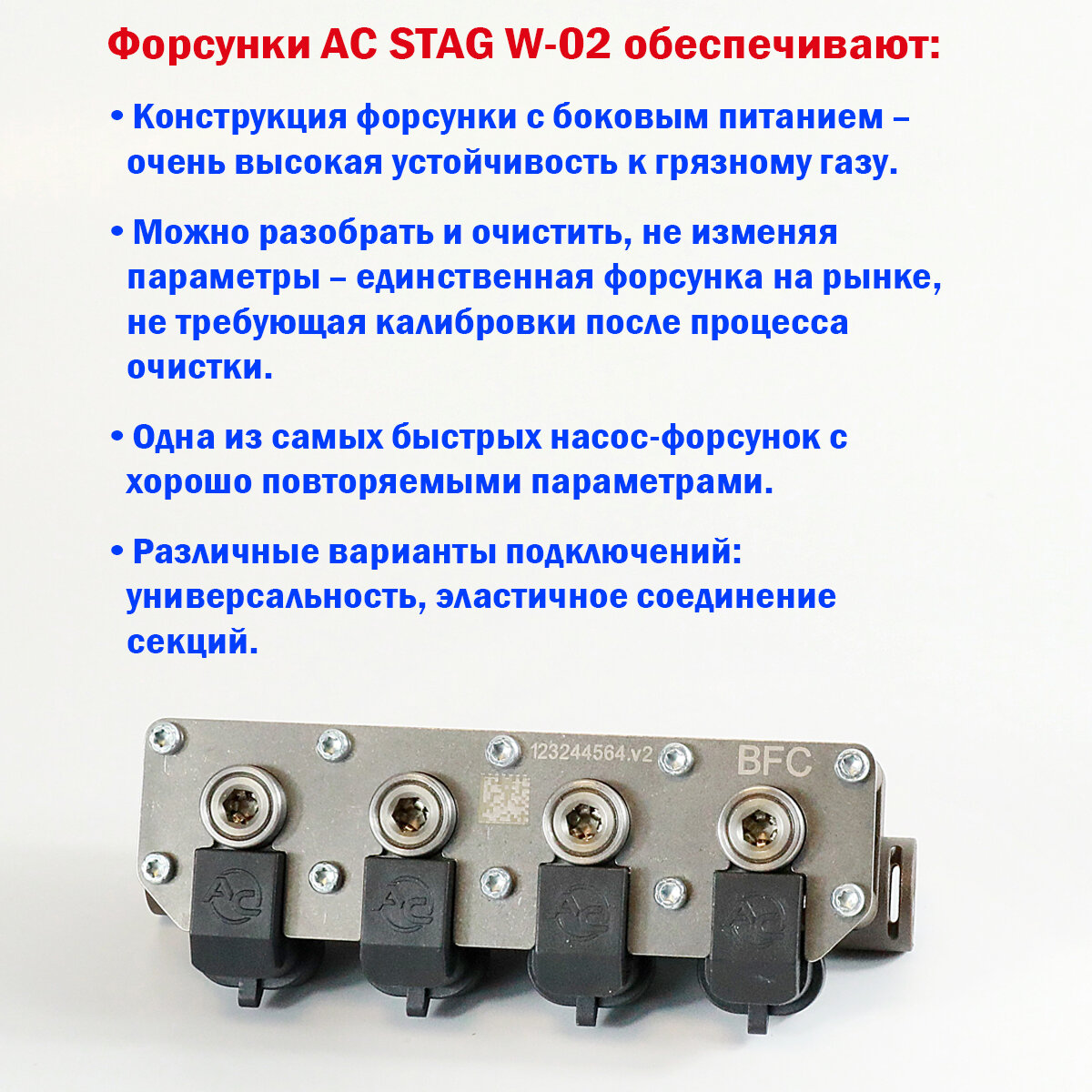 Форсунки AC STAG W-02 предназначены для газобаллонного оборудования LPG и CNG, во всех двигателях транспортных средств, в том числе, с турбокомпрессорным наддувом.