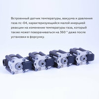 Применяемая система соединительных элементов допускает большое количество конфигураций монтажного положения. Уникальная конструкция позволяет установить на любой стороне встроенный датчик температуры, вакуума и давления газа PS-04, характеризующийся малой инерцией реакции на изменение температуры газа, который также может поворачиваться на 360 ° даже после установки в форсунку.