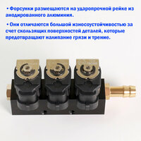 Форсунки размещаются на ударопрочной рейке из анодированного алюминия. Они отличаются большой износоустойчивостью за счёт скользящих поверхностей деталей, которые предотвращают налипание грязи и трение.
