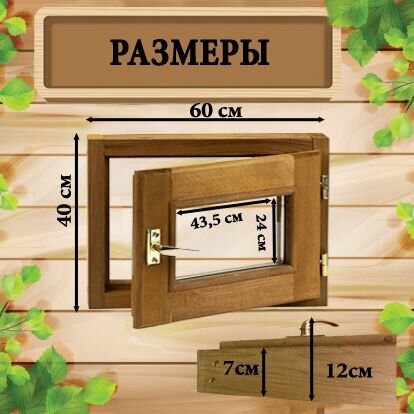 Габаритный размер окна: высота 40 см, ширина 60 см, глубина 7 см (по коробке), общая глубина с ручкой 12 см.