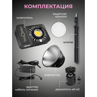 | особенности | выбор режима свечения, пульт ДУ, регулировка цветовой температуры, регулировка яркости освещения, штатив в комплекте |