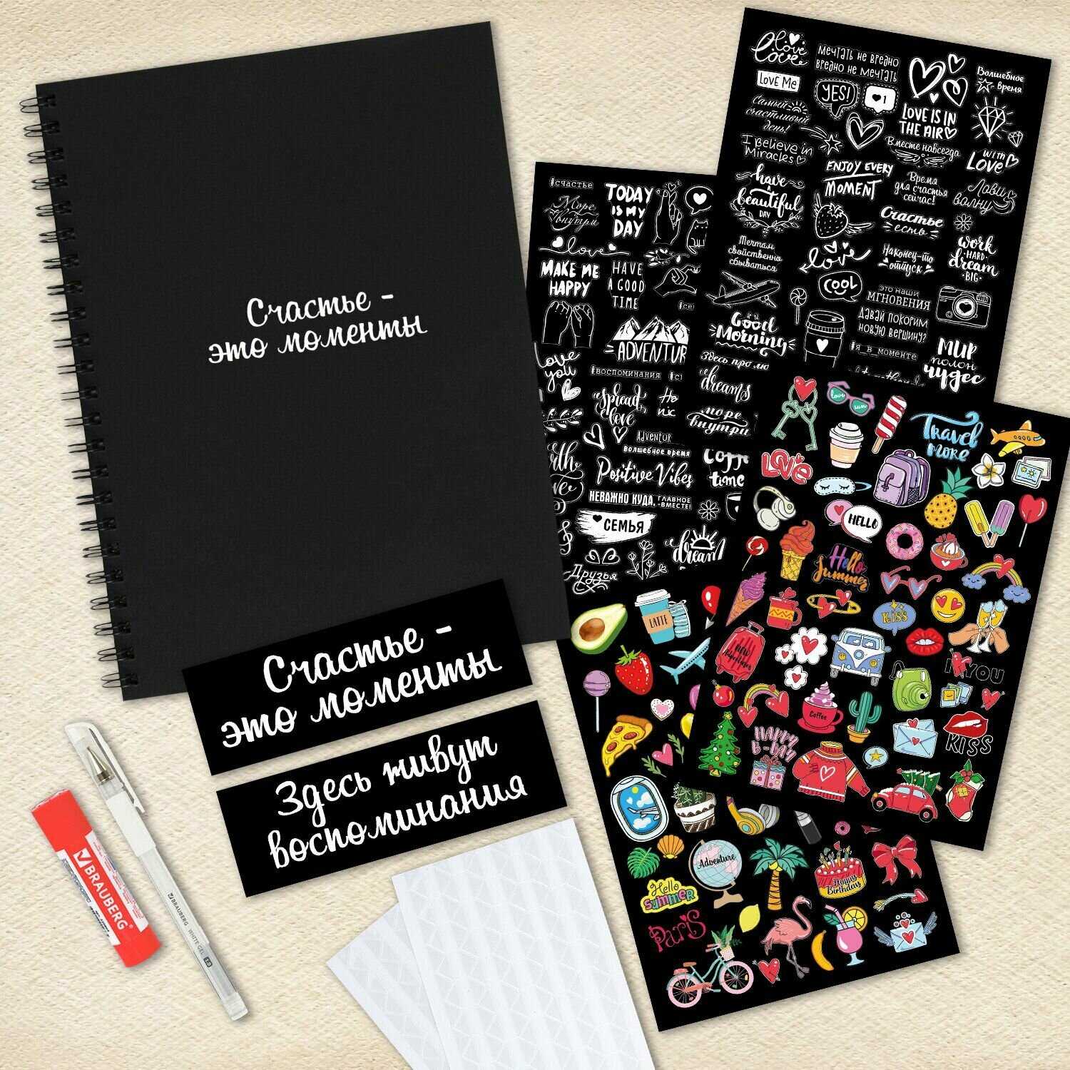 Фотоальбом BRAUBERG 880653Фотоальбом 22х30 см, 24 черных листа, уголки, стикеры, ручка, клей, BRAUBERG Black Line, 880653Фотоальбом BRAUBERG станет настоящей копилкой памятных дат и событий, а также отличным подарком. Фотоальбом на пружине состоит из 24 бумажных листов чёрного цвета размером 22x30 см, без карманов. Это позволяет размещать фотографии на одной странице, а также оставлять рядом с фото надписи от руки, рисунки, наклеивать креативные стикеры. В комплекте с фотоальбомом: 2 надписи на обложку альбома (размером 3,7x13,2 см), 2 листа (формата А5) чёрно-белых и 2 листа (формата А5) цветных стикеров, 408 самоклеящихся прозрачных уголков для фото, белая гелевая ручка и клей-карандаш. Обложка фотоальбома уплотненная – 400 г/м2. Большое количество дополнительных аксессуаров поможет сделать фотоальбом уникальным. Оформление такого фотоальбома – это безудержный полёт фантазии и креатива! Располагайте фотографии как хочется, украшайте альбом стикерами, оставляйте надписи, комментарии и рисунки – создайте памятную книгу своими руками! Тип листов: чёрные бумажные листы. Макс. количество фотографий: 200 шт. Размер фотографий: 10х15 см, 13х18 см, 18х24 см, 20х30 см. Тип обложки: твердая. Однотонный цвет обложки: да. Базовый цвет обложки: черный. Количество листов: 24 шт. Размер листа: 22х30 см. Скрепление страниц: спираль. Цвет страниц: черный. Высота альбома: 30 см. Ширина альбома: 22 см. Ширина корешка: 2.5 см. Упаковка: гофрокороб Бренд - BRAUBERG. Производитель - Россия. . Штрихкод - 4606224391663Характеристики упаковки: Вес:0,8300 кг. Объем: 0,0039 м3. Размеры: 3,5x32,4x25,1 см.