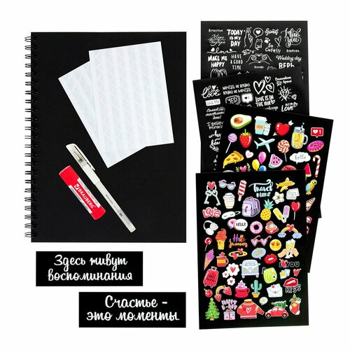 Фотоальбом на пружине состоит из 24 бумажных листов черного цвета размером 22x30 см, без карманов. Это позволяет размещать фотографии на одной странице, а также оставлять рядом с фото надписи от руки, рисунки, наклеивать креативные стикеры. В комплекте с фотоальбомом: 2 надписи на обложку альбома (размером 3,7x13,2 см), 2 листа (формата А5) черно-белых и 2 листа (формата А5) цветных стикеров, 408 самоклеящихся прозрачных уголков для фото, белая гелевая ручка и клей-карандаш. Обложка фотоальбома плотная – 400 г/м2, плотность внутренних листов – 250 г/м2. Большое количество дополнительных аксессуаров поможет сделать фотоальбом уникальным. Оформление такого фотоальбома – это безудержный полет фантазии и креатива! Располагайте фотографии как хочется, украшайте альбом стикерами, оставляйте надписи, комментарии и рисунки – создайте памятную книгу своими руками!