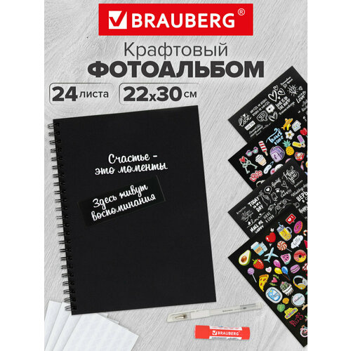 Фотоальбом BRAUBERG позволяет разместить фотографии разных размеров на одной странице, оставлять ручные надписи, рисунки, а также наклеивать креативные стикеры. Альбом для фото 10х15 18х24 13х18 см — блестящий свадебный подарок молодоженам, сюрприз любимому мужчине или женщине на семейное торжество. Фотоальбом подарочный оживит воспоминания о первой улыбке новорожденного, школьном выпускном или свадьбе. Этот альбом для фото большой упорядочит вашу коллекцию фотокарточек, неважно, были они сделаны на фотоаппарат, телефон или polaroid. Изготовленный из 24 бумажных листов черного цвета 22x30 см на пружине, фотоальбом будет радовать глаз и сердце. В комплекте с альбомом: 2 надписи на обложку, 2 листа А5 черно-белых и 2 листа цветных стикеров, 408 самоклеящихся прозрачных уголков для фото, белая гелевая ручка и клей-карандаш. Размеры 22x30 см делают фотоальбом детский компактным и удобным для хранения. Такой фотоальбом 10х15 см прекрасно подойдет как подарок для друга и подруги, парня и девушки, жены и мужа, родителей, влюбленной пары. Семейный альбом для фотографий будет уместно преподнести на юбилей, годовщину свадьбы, день рождения, международный женский день 8 марта, день святого Валентина 14 февраля, день матери, на выписку из роддома для малыша с рождения и по любому другому значимому поводу. Располагайте фотографии как хочется, украшайте альбом стикерами, оставляйте записи, комментарии и рисунки – создайте памятную книгу своими руками!