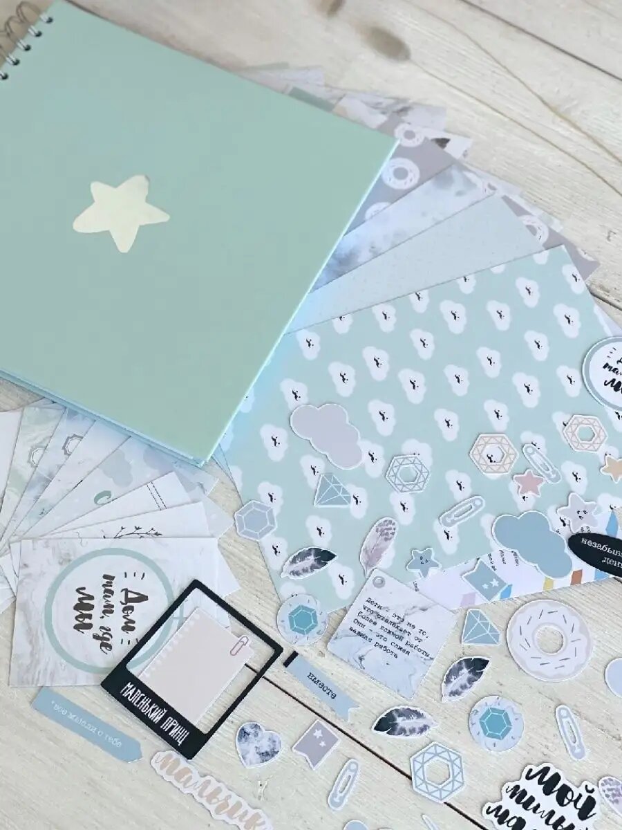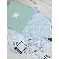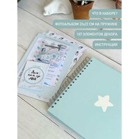 Альбом для новорождённых, ведётся с беременности или рождения. С комплектом заготовок в виде стикеров, наклеек, высечек, карточек, дизайнерской бумаги с принтами и стикерпаками можно создать уникальную, яркую фотокнигу. Вы сможете легко и просто запечатлеть важные моменты, дополняя страницы подписями. Твердая обложка сделана в виде книжного переплета на кольцах выполнена с серебряным фольгированным тиснением на лицевой части. Плотные бумажные листы 300 г/м2 созданы в цвете айвори для вклеивания фотоснимков разными способами.