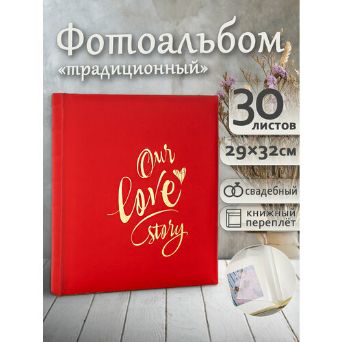 Традиционный свадебный фотоальбом с белыми листами из плотной, очищенной от кислот бумаги (180 г/м. кв), листы проложены вставками из пергамина (кальки). Размер листа: 30 х 33 см, 30 страниц скреплено в книжный переплет. Фотографии крепятся на уголки, двусторонние клейкие стикеры или фотоклей. Для свадебных фото, снимков медового месяца, годовщины свадьбы, истории романтических отношений и так далее. Твердая обложка обтянута искусственной кожей. Альбом поставляется в картонной подарочной коробке.