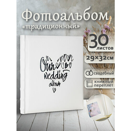 Традиционный свадебный фотоальбом с белыми листами из плотной, очищенной от кислот бумаги (180 г/м. кв), листы проложены вставками из пергамина (кальки). Размер листа: 30 х 33 см, 30 страниц скреплено в книжный переплет. Фотографии крепятся на уголки, двусторонние клейкие стикеры или фотоклей. Для свадебных фото, снимков медового месяца, годовщины свадьбы, истории романтических отношений и так далее. Твердая обложка обтянута искусственной кожей. Альбом поставляется в картонной подарочной коробке.