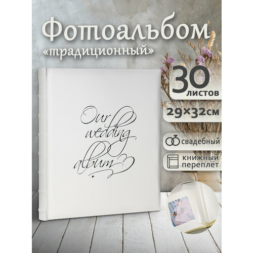 Традиционный свадебный фотоальбом с белыми листами из плотной, очищенной от кислот бумаги (180 г/м. кв), листы проложены вставками из пергамина (кальки). Размер листа: 30 х 33 см, 30 страниц скреплено в книжный переплет. Фотографии крепятся на уголки, двусторонние клейкие стикеры или фотоклей. Для свадебных фото, снимков медового месяца, годовщины свадьбы, истории романтических отношений и так далее. Твердая обложка обтянута искусственной кожей. Альбом поставляется в картонной подарочной коробке.