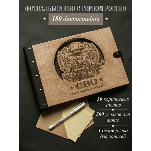Ищете оригинальный и запоминающийся подарок? Фотоальбом из дерева СВО с коричневыми листами – отличное решение! Размер альбома 32х22 см, размер листа А4 29х21 см, а рабочее поле 28х20 см (уже вычли отверстия). В фотоальбоме 30 листов (60 страниц) для вашего творчества. При наполнении альбом не раздует от фотографий. Рекомендуемые размеры фотографий – 10х15, 21х15, 25х20, 10х10, 15х23, 13х18. Наполнение альбома зависит от выбранного размера, но в качестве примера – стандартного размера фотографий 10*15 получится установить от 120 до 180 шт, если устанавливать по две-три фотографии на страницу. Альбом изготовлен из дерева, березовой фанеры, с натуральной кожаной вставкой. Уникальность продукта в том, что каждый фотоальбом изготавливается и собирается вручную российскими мастерами. Коричневые фактурные листы создают контраст и придадут особый шик всем вашим снимкам. Установите фото, подпишите событие и у вас получится не просто альбом, а самый главный хранитель воспоминаний. Для установки фотографий мы положили в комплект прозрачные самоклеящиеся уголки, которых хватит на установку 125 фото (5 упаковок). Этот военный фотоальбом станет отличным подарком, который оценят жених, муж, друг, папа, брат, любимой, парень, мужчина, коллега. ДМБ, Специальная военная операция, армия России. В подарок на память о службе. Брутальный мужской альбом.