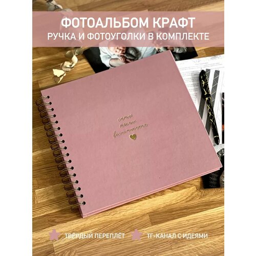 Наше время бесценно, а вместе с ним эмоции, которые хочется запомнить. Наши крафтовые фотоальбомы помогут вам в этом. Это не просто семейный альбом, а огромное пространство для воплощения вашего творчества и идей. Чтобы сохранить в памяти все воспоминания о разных событиях жизни мы создали серию: «Самые теплые воспоминания», которые отличаются цветом обложки. С альбомом идет лист фотоуголков (102 шт), черная гелевая ручка, инструкция, ссылка на наш ТГ-канал с идеями по заполнению. Пустые страницы цвета айвори позволят создать уникальную, яркую фотокнигу. Вы сможете легко и просто запечатлеть важные моменты, дополняя страницы подписями и рисунками. Твердая обложка с софт-тач покрытием сделана в виде книжного переплета на кольцах, дополнена золотым фольгированным тиснением на лицевой части. Внутри плотные бумажные листы 300 г/м2 для вклеивания фотоснимков разными способами. Первый лист - декоративная калька с цветочным принтом. Будет прекрасным подарком для влюбленных пар на свадьбу или любой другой праздник. Идеален как свадебная книга пожеланий, где гости могут оставлять свои поздравления и фотоснимки. Подойдет для выпускного альбома в детском саду, начальной школе. Можно использовать как скетчбук, для скрапбукинга, открыток или подарочный вариант для путешествий. Подходит как для маленьких фотокарточек 10х10 10x15, полароид, instax, инстакс, mini мини, так и 13х18 15х20, 15х21 20х23. Помещается до 200 штук фоток, в зависимости от их размера. Храните самые добрые воспоминания!