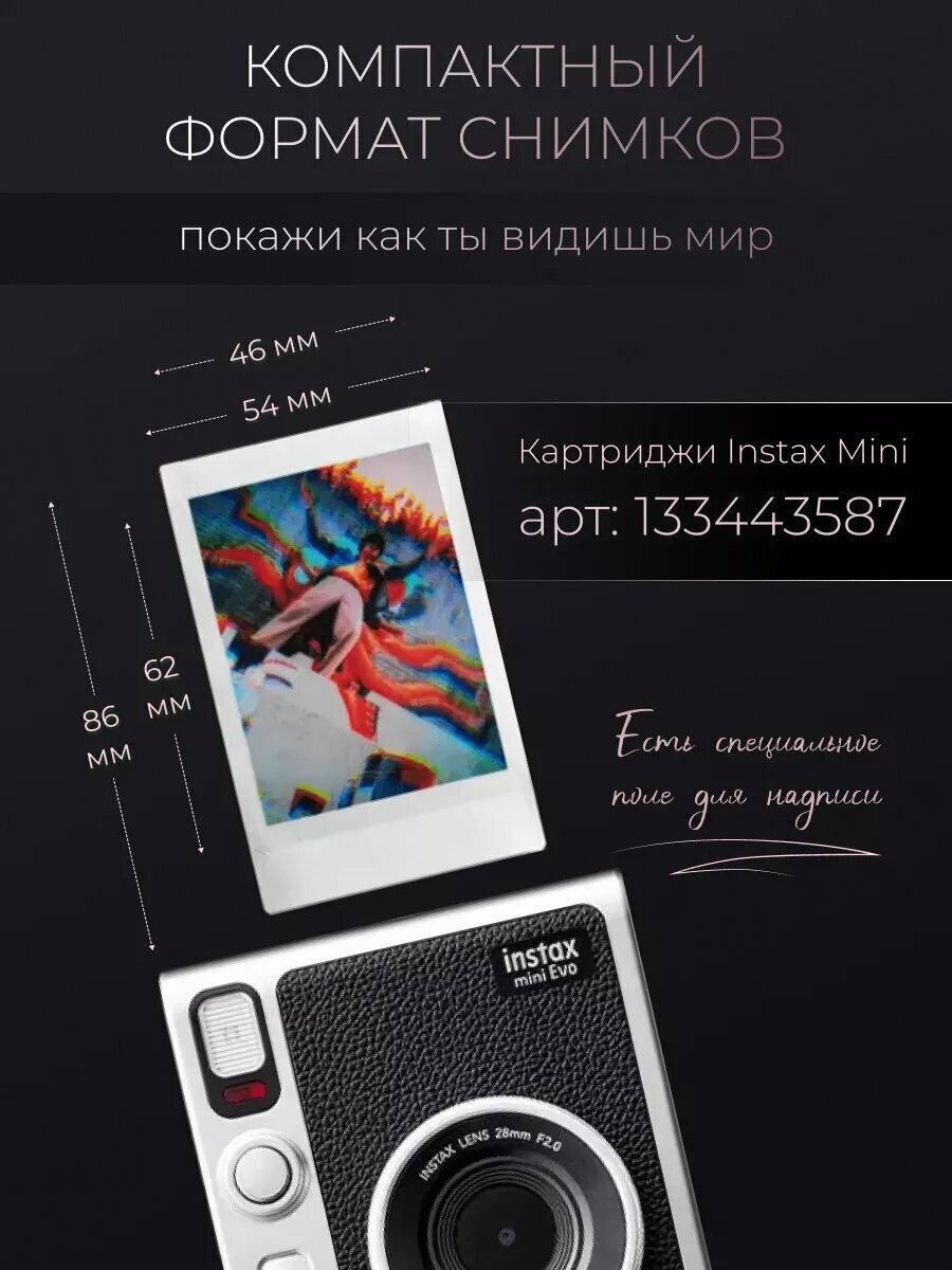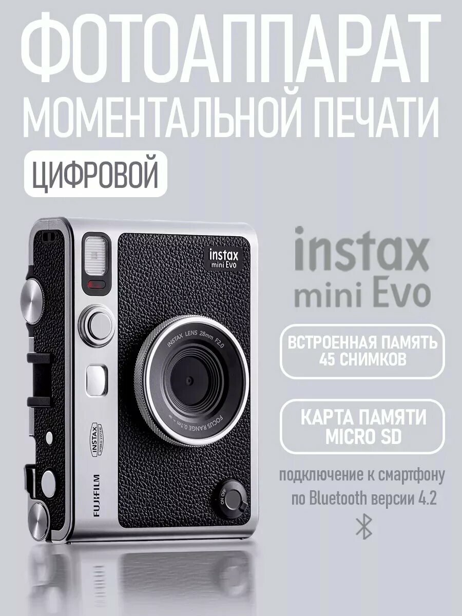 Instax Mini Evo от Fujifilm цифровой фотоаппарат мгновенной печати в стиле Ретро. Он сочетает в себе особенности и плёночной, и цифровой камеры. Вы сразу же получате готовые фотографии , но так же вы можете их отобрать, сохранить в памяти камеры , внести дополнительные обработки , переслать на телефон или принтер. Изображения сохраняются на внутренней памяти фотоаппарата (40-45 снимков) или на карте памяти microSD (продается отдельно). Для печати необходимы картриджи Instax Mini. Размер карточки 86 x 54 мм, размер изображения 62 x 46 мм. Камера имеет возможность подключаться к смартфону с помощью Bluetooth версии 4.2. Отснятые фотографии можно сразу же перекидывать на телефон , либо переслать изображение со смартфона на камеру и тут же её распечатать.