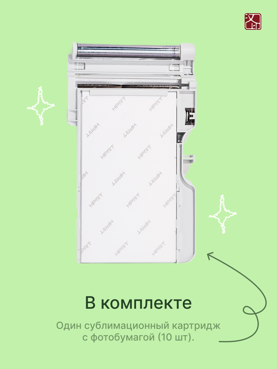 - Готовность к печати из коробки. В комплект входит картридж на 10 фото — можно сразу начать печать, не докупая расходники отдельно.