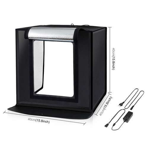 Основной материал: нейлоновая ткань Освещение: 2 панели по 12 Вт (32 светодиодов), 2х 1200 лм Цветовая температура: 5500К Питание: 110~240В, 1А Размеры: 40 х 40 х 40 см В сложенном виде: 40 х 40 х 3 см Вес брутто: 2.03 кг