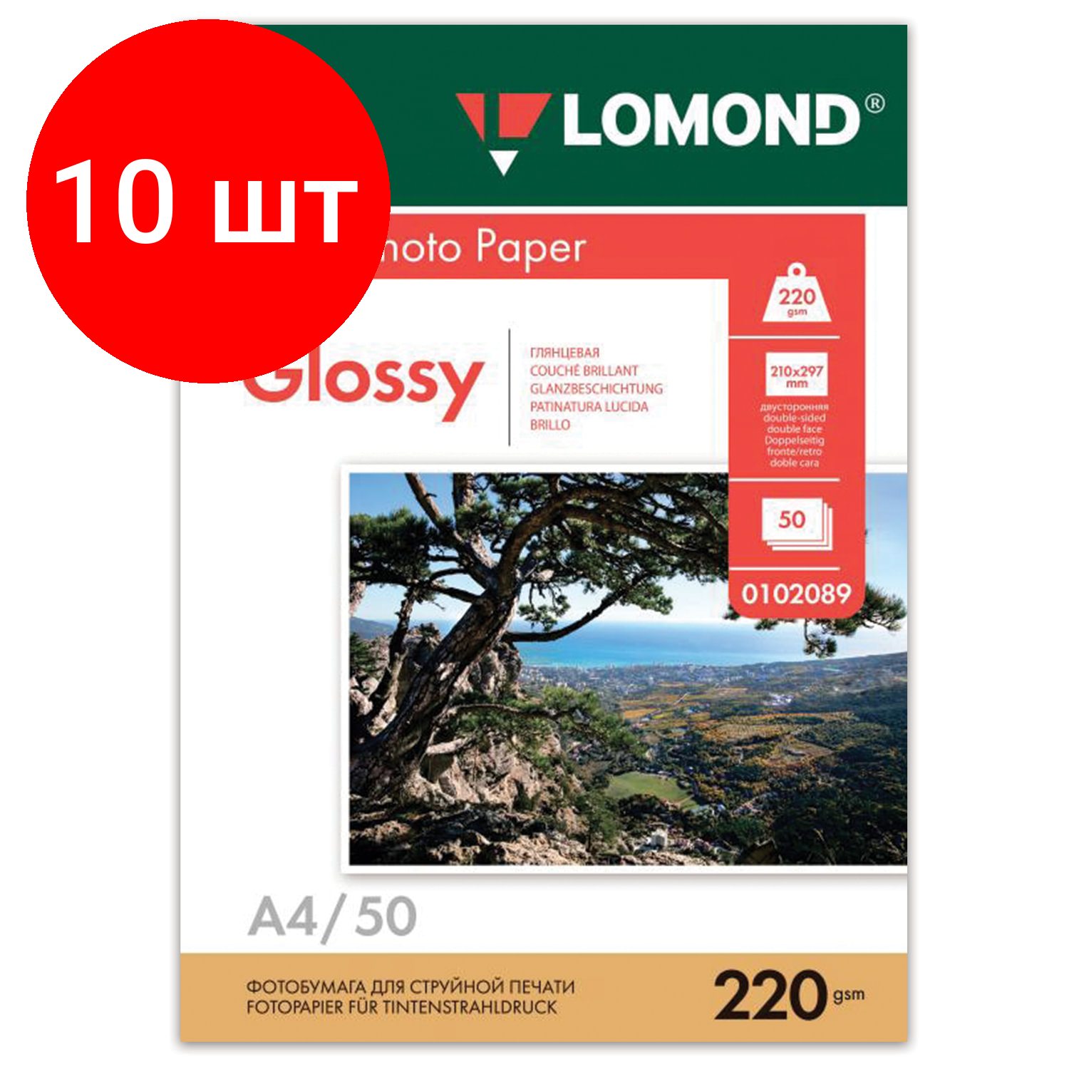 Комплект 10 шт, Фотобумага А4, 220 г/м2, 50 листов, двусторонняя, глянцевая, LOMOND, 0102089: сравнение цен, характеристики, фото, актуальное наличие и цены.