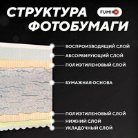 Преимущества фотобумаги FUMIKO • Чистое сырье из Индонезийской целлюлозы. Более мелкие волокна древесины с дополнительной системой очистки и абсорбции примесей. Бумажное полотно получается значительно светлее и ровнее. Высокая гладкость за счет отсутствия мусора и щепы дает возможность создать слой более плотным. • Отбеливание диоксидом кремния вместо хлорной технологии. Безопасность для потребителя, отсутствие окислительных реакций при контакте с чернилами. Увеличен срок выцветания краски. • Двойное каландрирование полотна. Ровная поверхность создается путем проката рулона через многотонные хромированные валы. На наших фабриках установлено два вала в системе. Увеличенная прочность нанесенного фотослоя. • Упаковка продукта на фабрике. Отсутствие пыли внутри пачки.