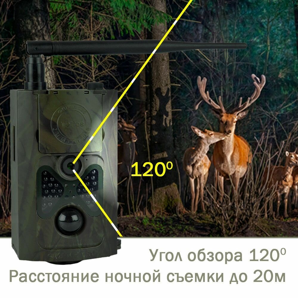 Фотоловушка Teltos 120 ММС - версия фотоловушки с отправкой данных по каналам 2G, с пультом дистанционного управления. Устройство имеет широкий угол обзора (120 градусов), мощные инфракрасные светодиоды (24 шт) с дальностью действия до 20 метров, 2G модуль связи для отправки данных, защиту корпуса IP54 для надежной работы на открытом воздухе. Для начала работы достаточно установить карту памяти и SIM-карту, 8 батареек типа АА, либо использовать дополнительный аккумулятор. Так-же можно подключить источник постоянного питания 220 вольт. Лесная камера оборудована удобным креплением, позволяющим закрепить на практически любом предмете (дерево, столб) под нужным углом, а маскировка корпуса скроет вашу фотоловушку от ненужных глаз.