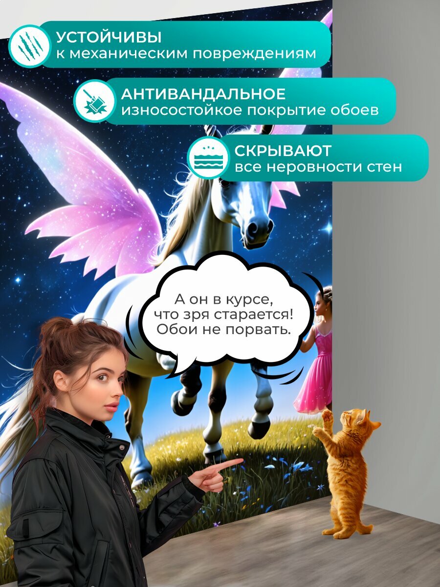 Фотообои моющиеся ударопрочные «Мистический единорог, окружённый мистическими феями, блуждает по звёздному небу, создавая атмосферу волшебства и» 200×300 см. флизелиновые на стену: сравнение цен, характеристики, фото, актуальное наличие и цены.