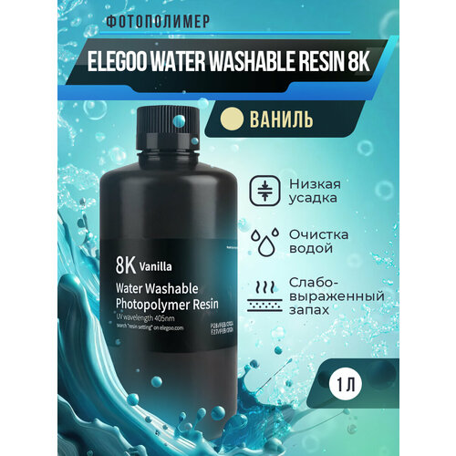 Фотополимер Elegoo Water Washable Resin 8K — экологичная, безопасная и простая в использовании фотополимерная смола, с помощью которой можно получать изделия с поразительной детализацией. Материал позволяет полностью реализовать возможности DLP/LCD/LED принтеров с разрешением до 8K. Он хорошо подходит для точной печати моделей и сложных прототипов.