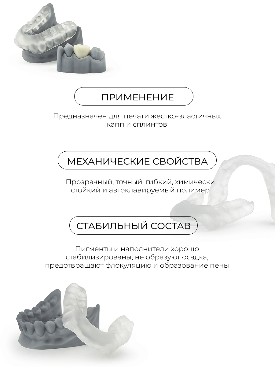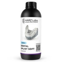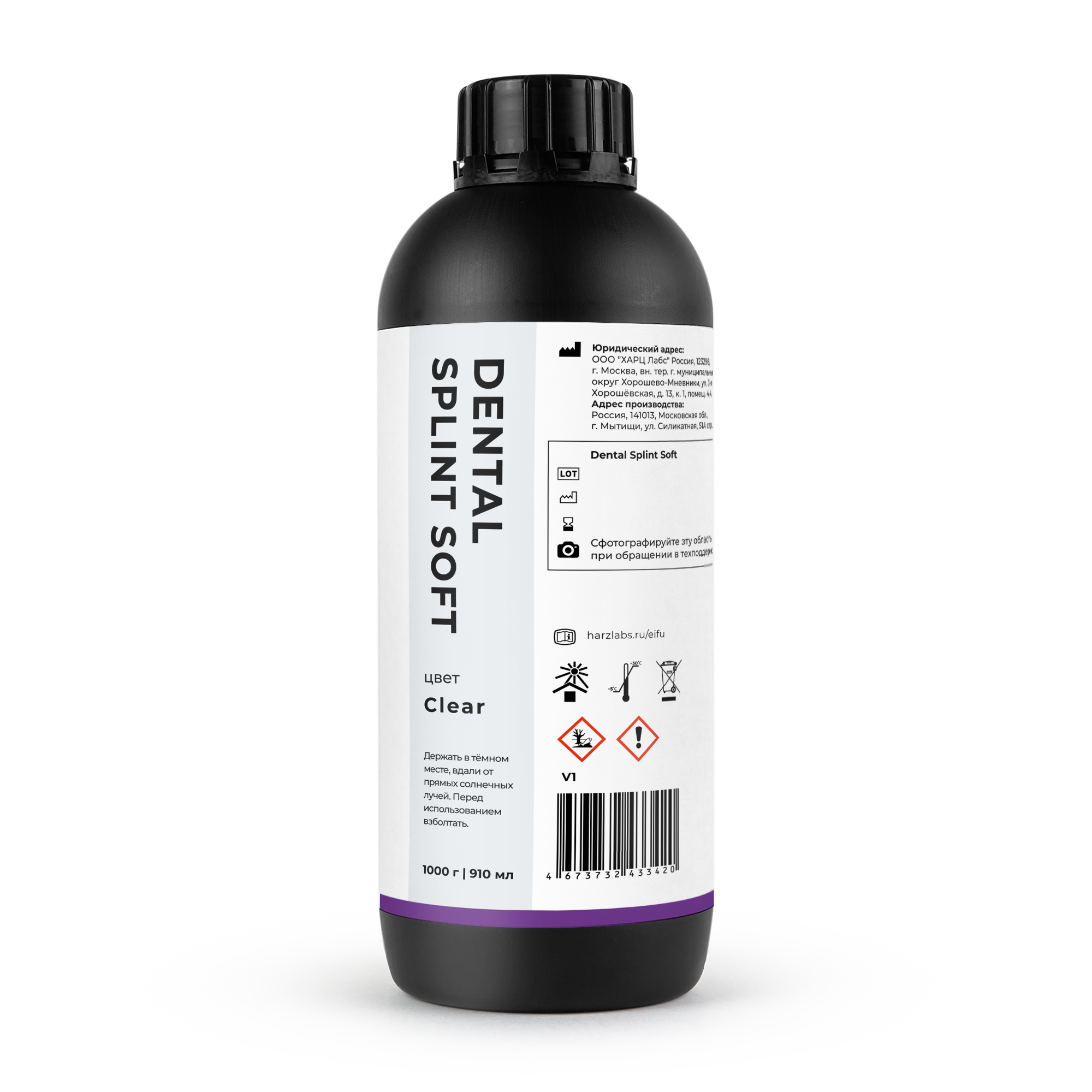 Фотополимерная смола HARZ Labs Dental Splint Soft – это гибкий и прочный фотополимер, предназначенный для изготовления жестко-эластичных капп и сплинтов. Состав смолы позволяет использовать ее даже в небольших помещениях, ведь она практически не имеет запаха, не вызывает аллергических реакций, не выделяет паров. Изделия из фотополимерной смолы можно обрабатывать в автоклаве, они химически устойчивы и соответствуют требованиям ГОСТ Р ИСО 10993.