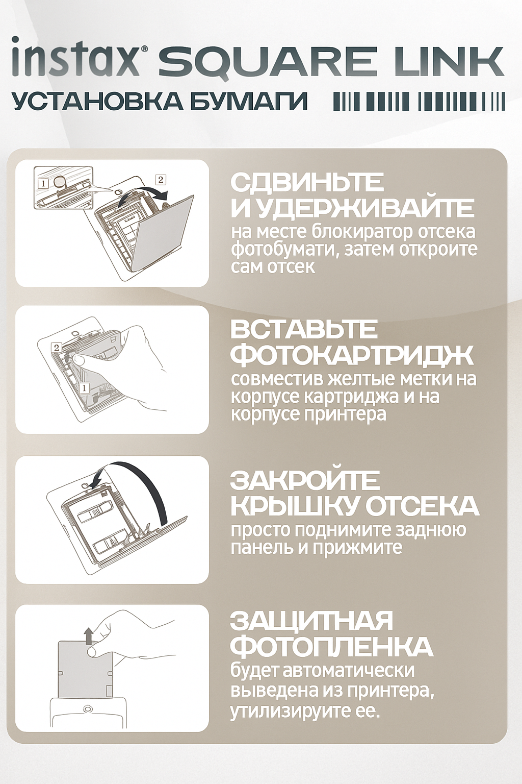 Фотопринтер Instax Square Link — это компактный и стильный способ мгновенно печатать ваши любимые снимки прямо со смартфона. Благодаря беспроводному подключению Bluetooth 5.1, вы можете легко печатать фотографии с устройств на Android и iOS. Компактный корпус из прочного пластика делает его идеальным спутником для путешествий и прогулок. Встроенный аккумулятор обеспечивает автономную работу, позволяя печатать фотографии в любом месте. Instax Square Link — это отличный выбор для тех, кто ценит мгновенные воспоминания и креативный подход к печати.
