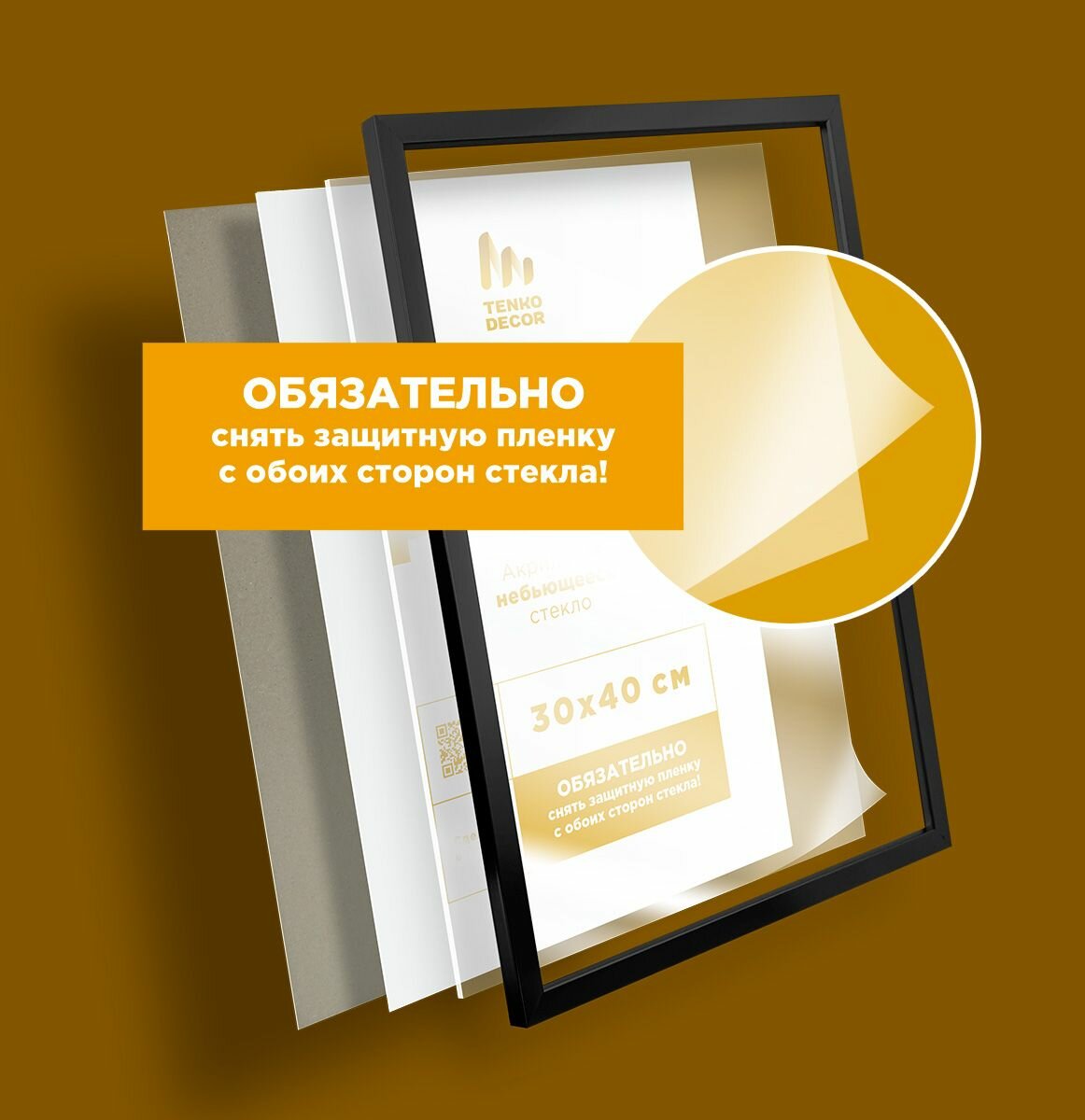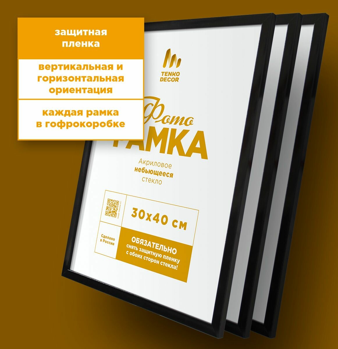 Набор фоторамок не поцарапан! Пожалуйста, не забудьте снять пленку с 2-х сторон перед использованием. Комплект фоторамок на стену (3 шт.) идеально подходит для больших фотографий формата А3, создания коллажей или расположения в детских комнатах. За счет безопасной пластиковой конструкции, можно не переживать за то, что фоторамки разобьются. Набор пластиковых фоторамок на стену TENKO DECOR включает в себя 3 рамки 30*40. Ширина профиля - 14 мм. Наши настенные фоторамки 30 х 40 см для фотографий не бьются! Вместо стекла мы используем пищевой пластик (ПЭТ 0,5 мм). Тот самый материл, из которого изготавливают бутылки для воды и прочих напитков. А главное, это дает Вам гарантию целостности при заборе из ПВЗ или в случае падения со стены. Наши рамки 30 на 40 без подставок! С обратной стороны рамок для фото имеется подвес, предполагающий вертикальное расположение, однако при желании вы можете переставить его на горизонтальною сторону для смены ориентации изображения или же разместить на столе.