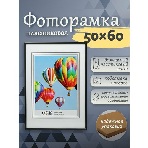Рамка для фотографии формата 50х60 см. При использовании паспарту рекомендуемый размер изображения 30х40 см (паспарту в комплекте не поставляется). Материал багета – пластик (PVC): обладает прочной структурой, надежен и долговечен в эксплуатации. Вставка из безопасного PS листа (пластик, 1 мм). Задник выполнен из плотного листа оргалита, на нем располагаются петли для настенного крепления: на крючок, гвоздь или нить (леску). Рамку можно размещать как вертикально, так и горизонтально. Помимо фотографий в рамке можно разместить плакаты, репродукции и так далее.
