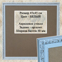 Рамка для садко белый размером 45х45 см – это рамка из классического картинного багета. Ширина багета 30 мм, высота 18 мм. Цвет рамки – белый. Из этого багета изготавливается более 30 размеров рамок, что позволяет создавать экспозиции на стене из фотографий любых размеров в едином стиле. Размер вставляемой фотографии 45х45 см, размер видимой части (вид спереди) 43,8х43,8 см. В состав рамки входит акриловое (пластиковое) стекло, задник из оргалита, комплект крепежа для вертикального или горизонтального подвешивания. Используются для пазлов, вышивок, аппликаций, других творческих работ.
