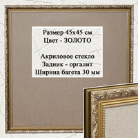 Рамка для садко золото размером 45х45 см – это рамка из классического картинного багета. Ширина багета 30 мм, высота 18 мм. Цвет рамки – золото. Из этого багета изготавливается более 30 размеров рамок, что позволяет создавать экспозиции на стене из фотографий любых размеров в едином стиле. Размер вставляемой фотографии 45х45 см, размер видимой части (вид спереди) 43,8х43,8 см. В состав рамки входит акриловое (пластиковое) стекло, задник из оргалита, комплект крепежа для вертикального или горизонтального подвешивания. Используются для пазлов, вышивок, аппликаций, других творческих работ.