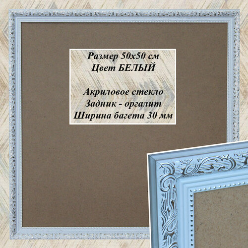 Рамка для садко Белый размером 50х50 см – это рамка из классического картинного багета. Ширина багета 30 мм, высота 18 мм. Цвет рамки – белый. Из этого багета изготавливается более 30 размеров рамок, что позволяет создавать экспозиции на стене из фотографий любых размеров в едином стиле. Размер вставляемой фотографии 50х50 см, размер видимой части (вид спереди) 48,8х48,8 см. В состав рамки входит акриловое (пластиковое) стекло, задник из оргалита, комплект крепежа для вертикального или горизонтального подвешивания. Используются для пазлов, вышивок, аппликаций, других творческих работ.