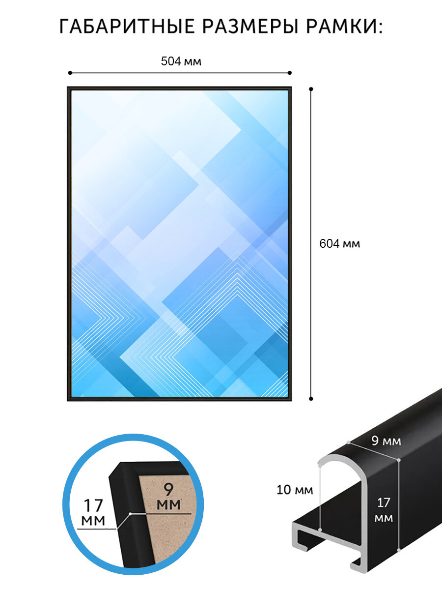 Данная фоторамка подходит для размещения постеров, фотографий, картин, дипломов, алмазных мозаик, вышивок, пазлов и даже зеркал. Внутренний размер 50x60 см позволяет разместить постер или картину без необходимости обрезать или подгонять размеры, при этом изображение будет перекрыто на 5 мм с каждой стороны. Размер самого изделия 504х604 мм.