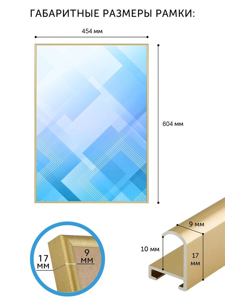 Рамка для постера или картины 45х60 см - это идеальный выбор для тех, кто ценит красоту и функциональность в своем интерьере. Она выполнена из металла (алюминия), что делает ее легкой, прочной и долговечной, а золотой цвет придает ей элегантный и современный вид.