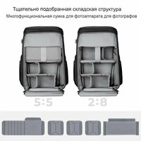 | Особенности | адаптация к фигуре, быстрый доступ, вентилируемая спинка, внешний карман, возможность организации внутреннего отсека, возможность фиксации на поясе, дождевик в комплекте, защита от воды, крепление для штатива, место для дополнительного объектива, модульная конструкция, отсек для личных вещей, ручка для переноски |