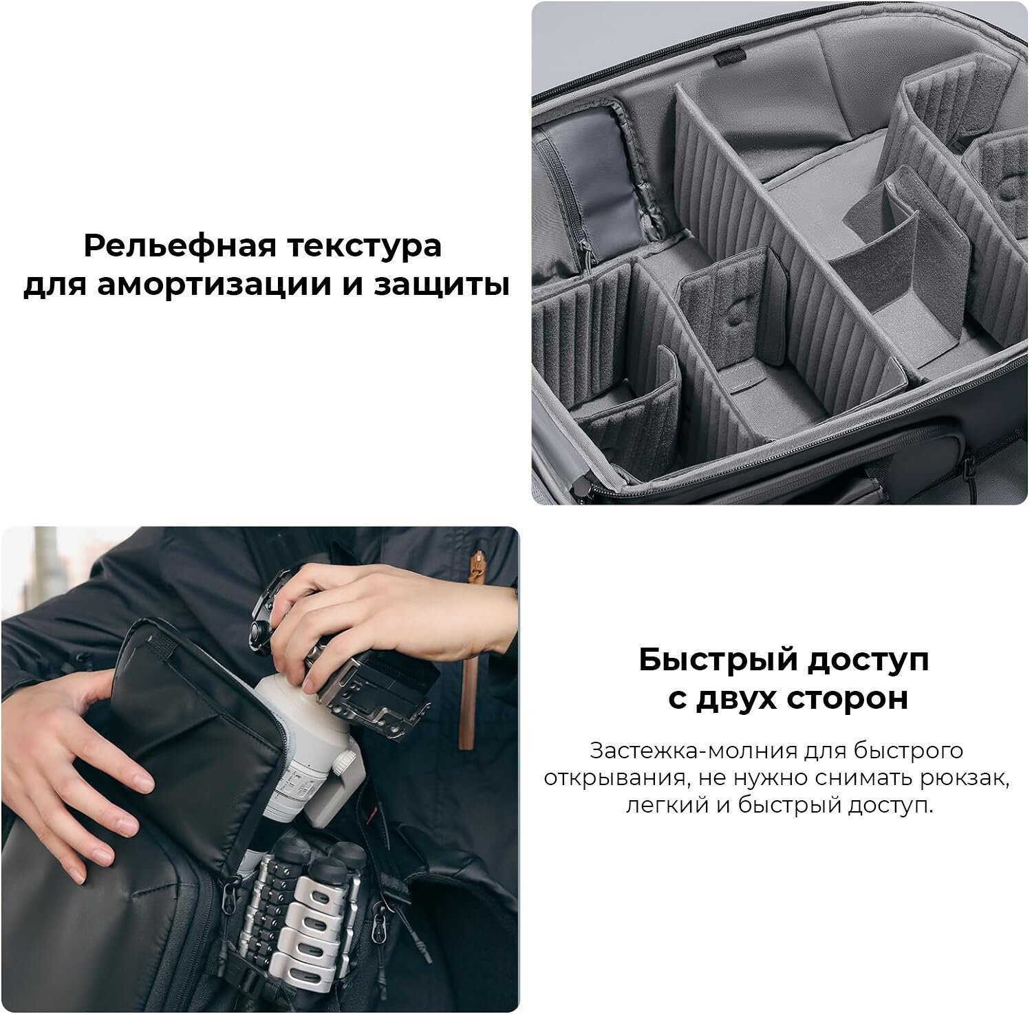 Быстрый доступ с двух сторон обеспечивается специальной конструкцией молнии, что позволяет быстро открыть сумку даже во время ношения без необходимости снимать ее. Рюкзак также оснащен множеством расширительных петель и ремней, которые позволяют индивидуально настраивать его размер для удобства каждого пользователя, а также удобно извлекать предметы. Продуманные двойные ручки для переноски обеспечивают возможность носить рюкзак самыми разными способами
