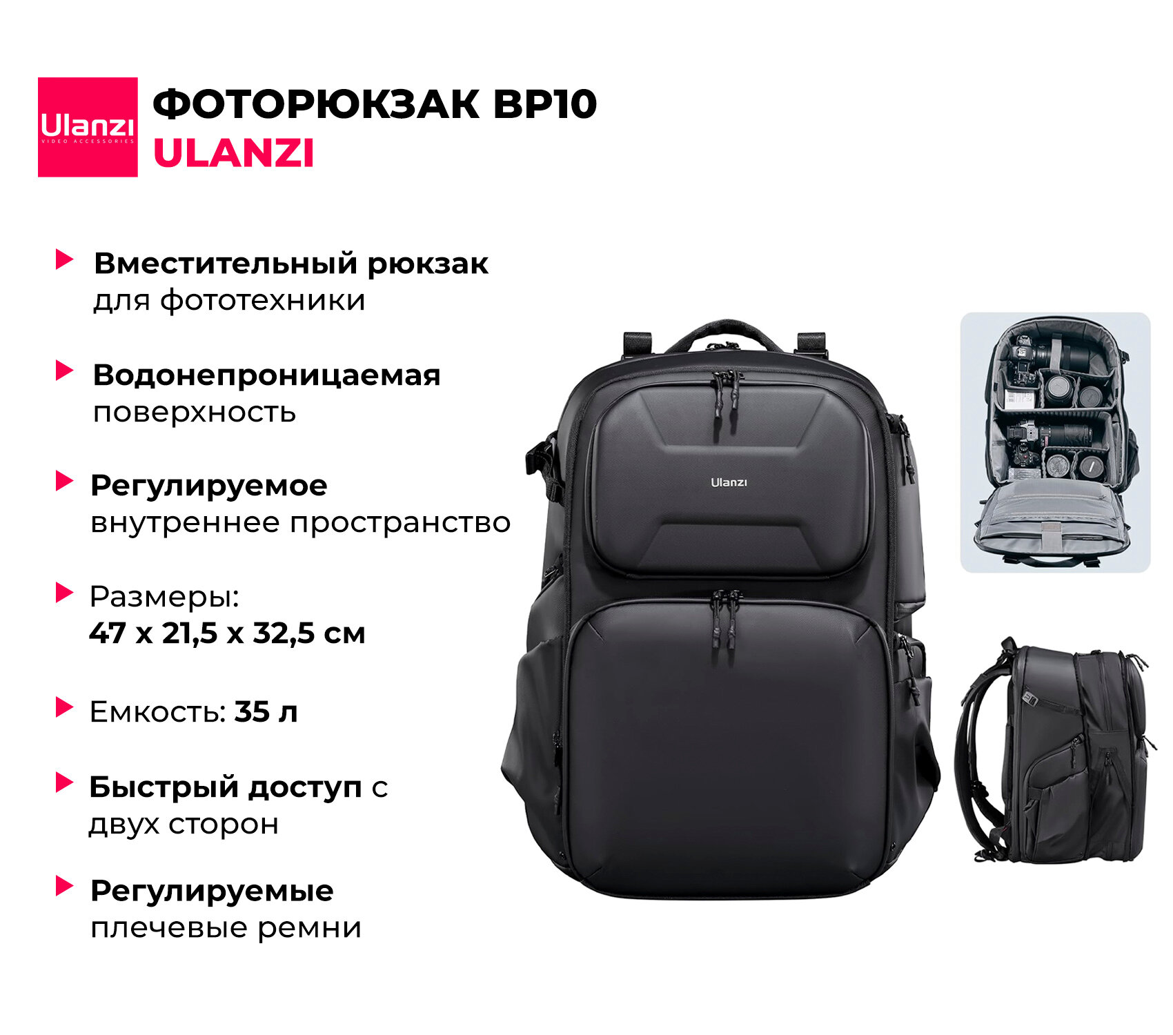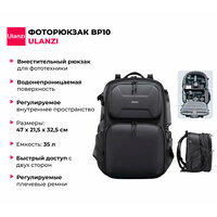 Ulanzi BP10 это удобный и функциональный рюкзак с объёмом 25 л с возможностью расширения до 35 л. Он идеально подойдет для профессиональных фотографов. С его помощью вы сможете легко организовать и перевозить свое фотооборудование. Рюкзак способен вместить как минимум 2 камеры и 6 объективов. Индивидуальные разделители обеспечивают удобную организацию вашего фотооборудования и предметов первой необходимости, а также предотвращают повреждения техники от столкновений друг с другом во время транспортировки.