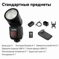 Полный контроль экспозицииВспышка Godox Ving V1 с круглой головкой и мощностью импульса 76 Дж представляет собой усовершенствованный источник света с функциями, которые отвечают самым современным требованиям фотографов. Кроме полной совместимости с режимом TTL, вспышка поддерживает режим компенсации экспозиции (FEC), брекетинг (FEB) и блокировку экспопары (FEL), а также такие функции, как: высокоскоростная синхронизация (до 1/8000 с), синхронизация по первой/второй шторке, функция стробоскопа. Мощность регулируется от 1/1 до 1/256 (9 стопов с шагом 1/10 стопа), длительность импульса составляет до 1/20000 с.