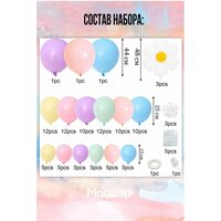 Создайте невероятную атмосферу праздника с помощью большого набора из воздушных шаров Мосшар. Фотозона из шаров отлично впишется в любое праздничное мероприятие, детский праздник или на свадьбу. Вам не нужно приглашать декоратора, чтобы украсить помещение. Арка из шаров довольно легко собрать самостоятельно, использовав только ручной насос. Мы предлагаем Вам готовый вариант фотозоны на любое мероприятие. Праздничная гирлянда из шаров один из незаменимых аксессуаров для украшения любого выпускного, юбилея и другого торжества. В подарочный набор входит всё необходимое для создания праздничной атмосферы: надувные шары разных цветов и размеров, дополнительные аксессуары, каркасная лента для сборки, скотч и клеевые точки для фиксации шариков. Благодаря фотозоне из шаров вы самостоятельно сможете оформить помещение или уличную территорию к любой вечеринке. Латексные шары можно скомпоновать по цветам и размерам и использовать для декорирования: оформить фотозону, собрать гирлянду или арку или же просто надуть их воздухом и разложить в хаотичном порядке. Для создания декора вам не понадобится гелий, так как шары можно надуть воздухом. Небольшие советы: 1. Шары не любят прямых солнечных лучей. В таком случае они могут начать тускнеть и принимать матовый оттенок, сдуваться 2. Шары не любят резкие перепады температур, соприкосновение с острыми или горячими предметами и передув. Это может привести к лопанью шаров. 3. Обязательно надувайте шары не больше заявленного диаметра. Помните, что цвет товара может незначительно отличаться от фото. А также ненадутые шарики всегда темнее надутых. Состав набора: 1 сиреневый шар 44 см, 1 розовый шар 44 см, 1 голубой шар 44 см, 3 ромашки 48 см, 12 желтых шаров 25 см, 12 розовых шаров 25 см, 10 сиреневых шаров 25 см, 12 мятных шаров 25 см, 10 нежно-розовых шаров 25 см, 10 голубых шаров 25 см, 5 желтых шаров 13 см, 5 розовых шаров 13 см, 5 сиреневых шаров 13 см, 5 мятных шаров 13 см, 5 нежно-розовых шарика 13 см, 5 голубых шара 13 см + клеевые точки 5 уп, зажимы для шаров в виде цветка 3 шт, двухсторонний скотч 1 шт, лента для крепления 1 шт.