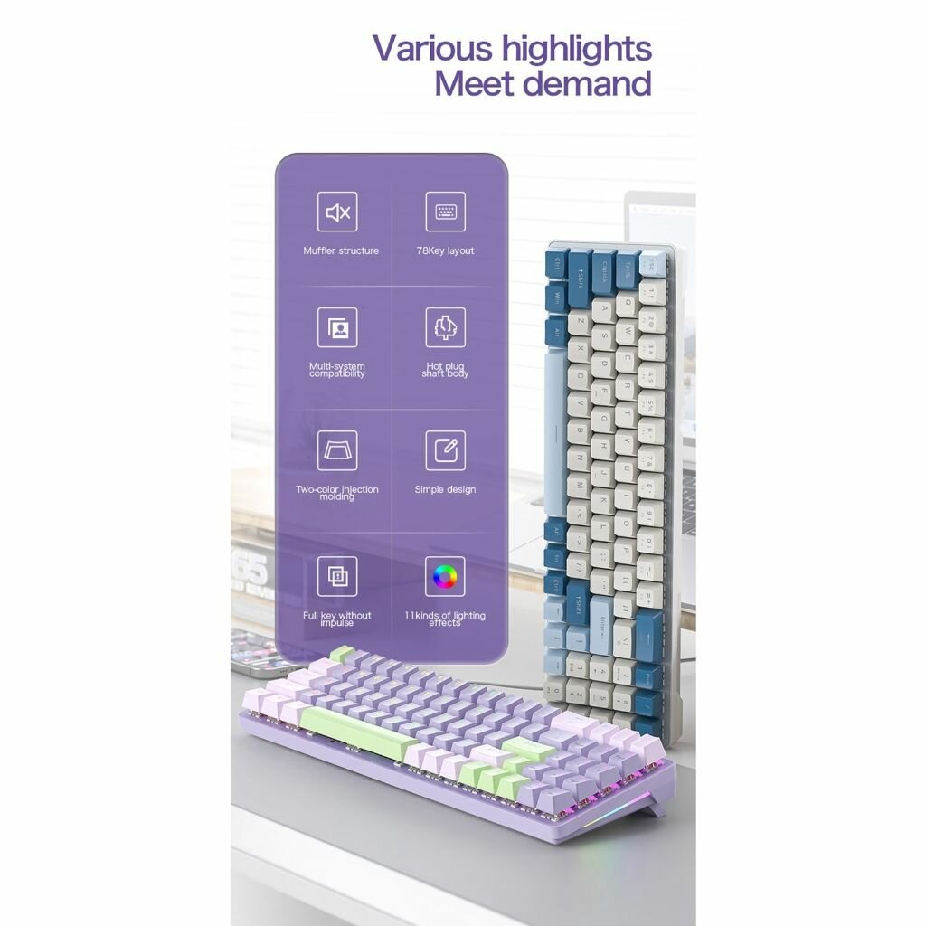Freewolf K65 Проводная механическая клавиатура с горячей заменой — голубой вал — черника: сравнение цен, характеристики, фото, актуальное наличие и цены.