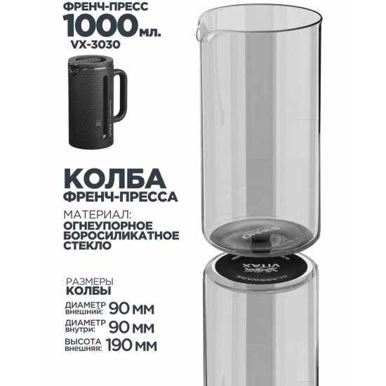 Френч-пресс VITAX объемом 1000 мл - это идеальный выбор для любителей чая, кофе и травяных настоев. Изготовлен из высококачественных материалов, он предназначен для длительного использования и станет незаменимым помощником на вашей кухне.