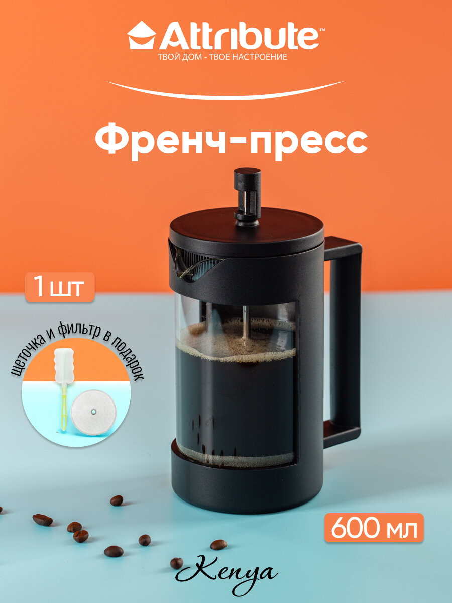 Френч-пресс KENYA 600 мл с аксессуарами — универсальное устройство для заваривания кофе, кофейных напитков, чая и травяных напитков. Френч пресс изготовлен из жаропрочного боросиликатного стекла и нержавеющей стали. Благодаря сетчатому фильтру мельчайшие чаинки, ягоды, кусочки фруктов, лепестки цветов и специи останутся в колбе, не попадут в кружку. Благодаря нижней подставке френч-пресс устойчив и не нагревает стол. Пластиковая ручка френч-пресса не нагревается и не обживает руки. Крышка надёжно фиксируется на чайнике, не позволяя напитку проливаться. Френч-пресс подойдет для заваривания чая и кофе как в горячем, так и холодном виде.