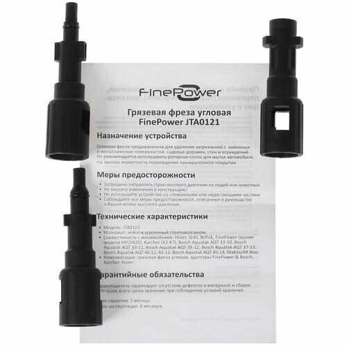 Фреза грязевая FinePower JTA0121 после подключения к мойке высокого давления обеспечивает эффективное удаление загрязнений с металлических и каменных поверхностей: к примеру, со стен, садовых дорожек и ограждений. Поскольку вода через этот аксессуар подается под очень высоким давлением, его не рекомендуется использовать для мытья автомобиля, поскольку высок риск повреждения лакокрасочного покрытия кузова. Грязевая фреза FinePower JTA0121 поставляется вместе с адаптерами, позволяющими подключить ее к мойкам высокого давления различных брендов.