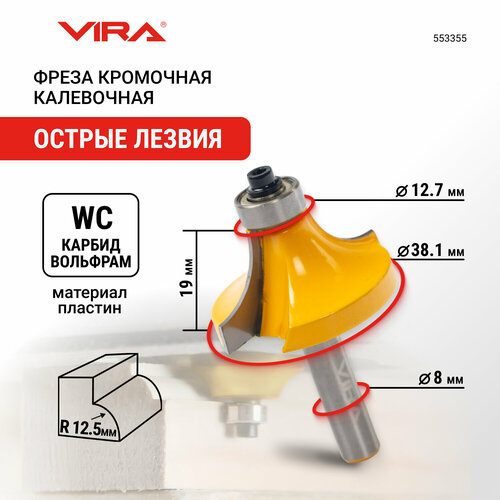 Купить Фреза кромочная калевочная 38.1 х 19 мм R 12.5 мм подшипник 12.7 мм хвостовик 8 мм VIRA с доставкой по всей России. Фреза кромочная калевочная 38.1 х 19 мм R 12.5 мм подшипник 12.7 мм хвостовик 8 мм VIRA: сравнение цен, характеристики, фото, актуальное наличие и цены.