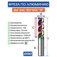 Фреза по алюминию концевая 8d*24C*8D*60L*3F HRC58 монолитная сверхтвёрдая с нанокомпозитным напылением nACo