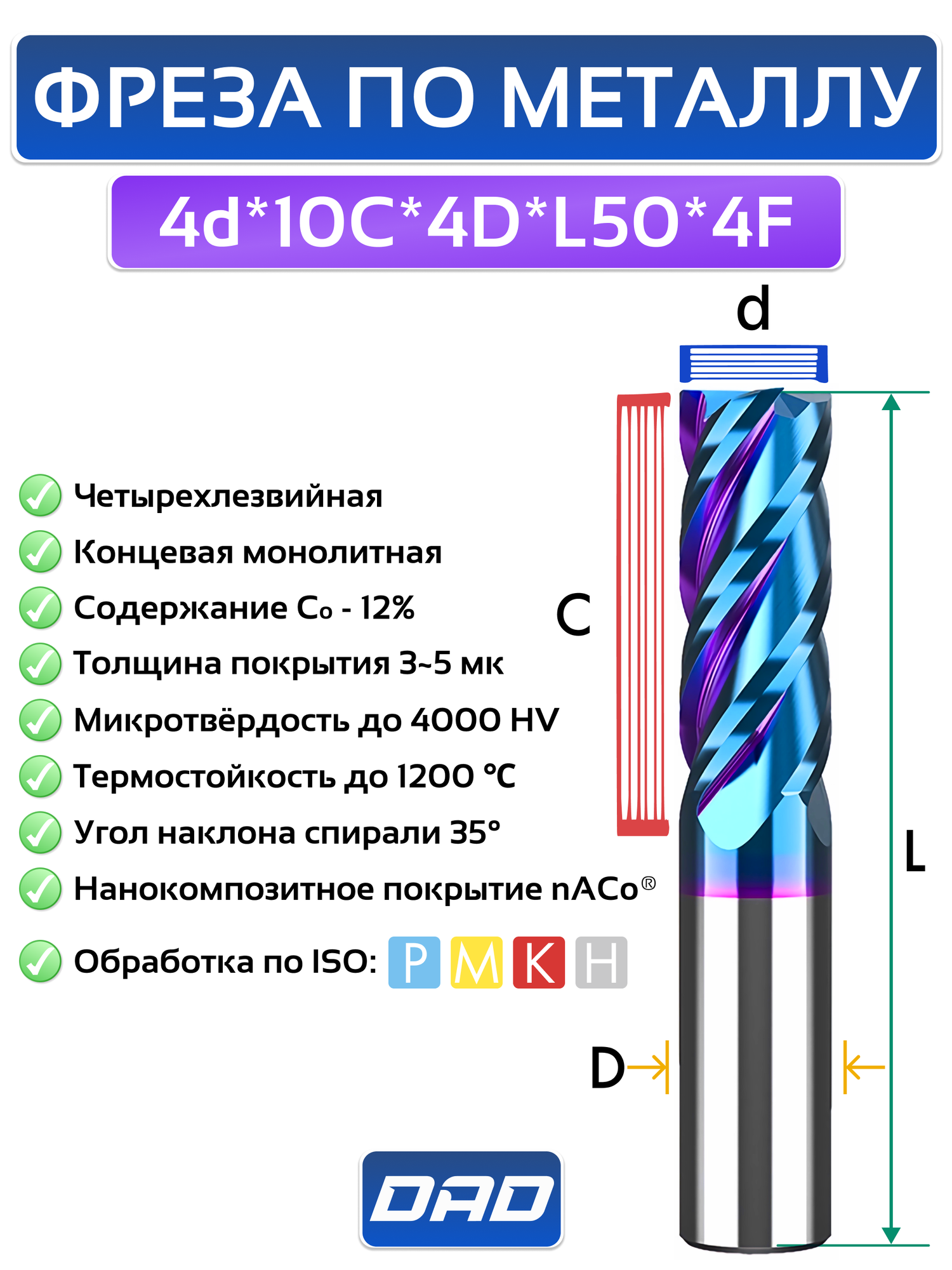 Фреза по металлу концевая 4d*10C*4D*L50*4F HRC65 монолитная сверхтвёрдая с нанокомпозитным напылением nACo: сравнение цен, характеристики, фото, актуальное наличие и цены.