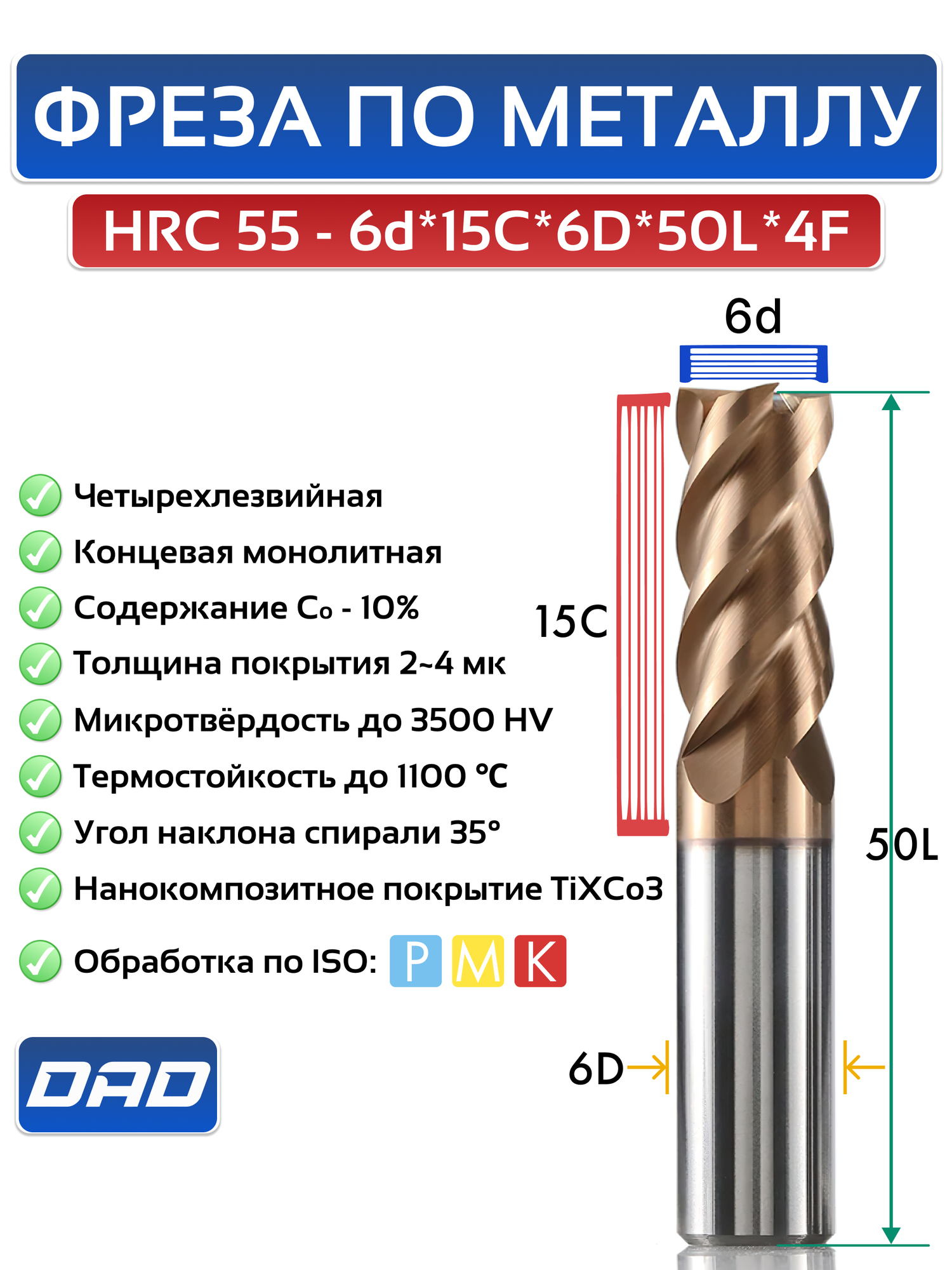 Фреза по металлу концевая 6d*15C*6D*50L*4F HRC55 монолитная твердосплавная с нанокомпозитным покрытием TiXCo3: сравнение цен, характеристики, фото, актуальное наличие и цены.