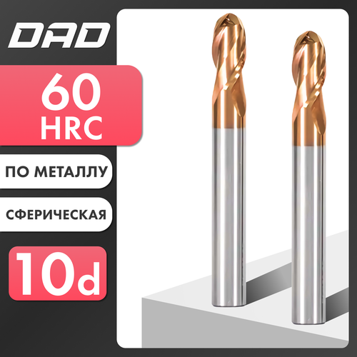 Твердосплавная монолитная 2-х лезвийная фреза со сферическим концом для обработки стали, чугуна и нержавеющих стали твердостью до HRC60. Изготовлена из порошкового твердого сплава с содержанием Co — 10%.