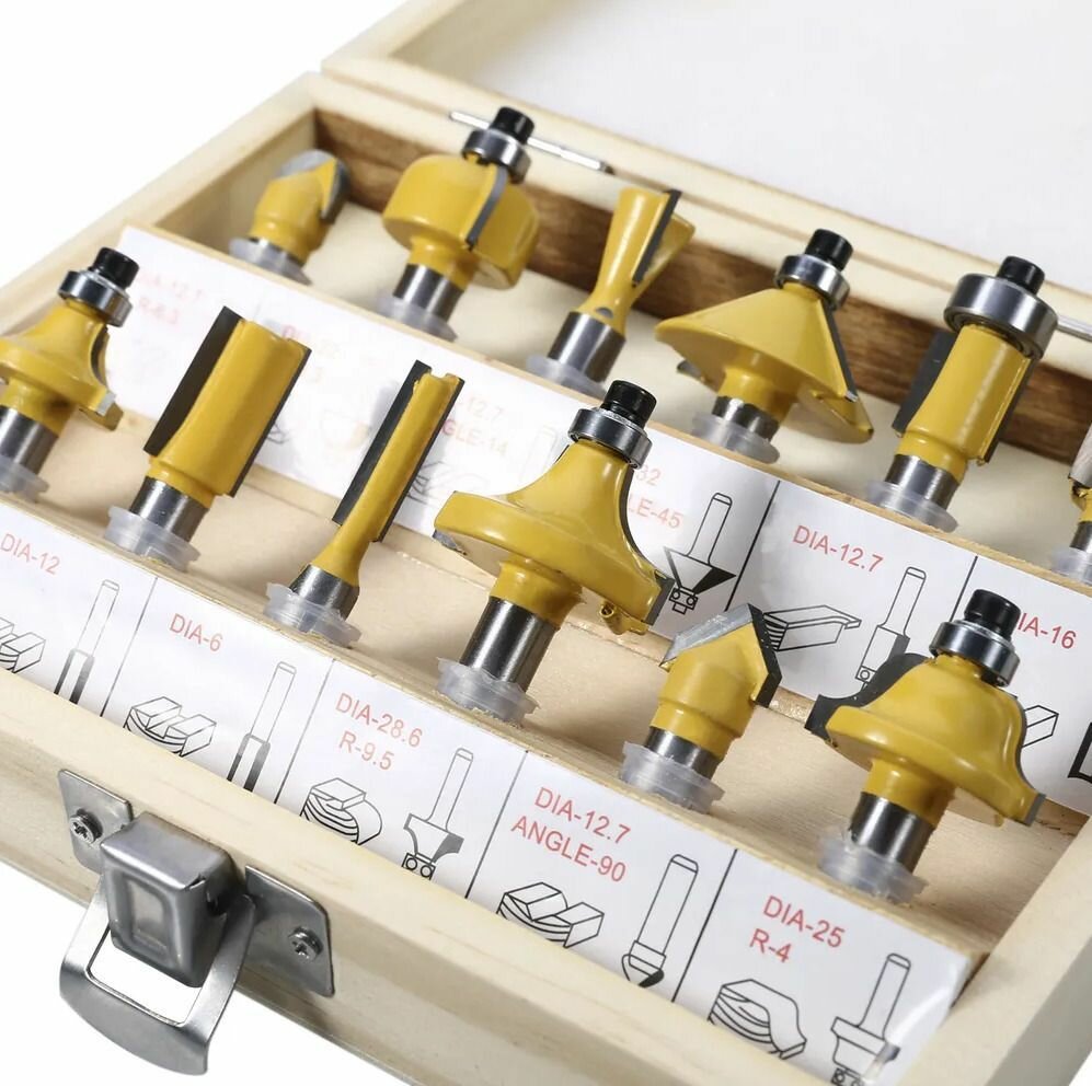 В комплектацию входит: фрезер (в частично разобранном виде), копировальная втулка, цанга 8мм и 6мм, ключ, пылеотвод, угольные щетки 2шт, набор фрез, руководство по эксплуатации.