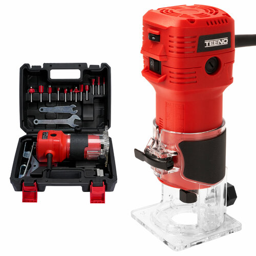 【Идеальный подарок】1 фрезер по дереву, 1 прямая направляющая, 1 направляющая для изогнутых кромок, 12 фрез (1/4'), 2 угольные щетки, 1 гаечный ключ, 1 руководство по эксплуатации. Все аксессуары упакованы в ящик для инструментов с твердой крышкой для удобной транспортировки.