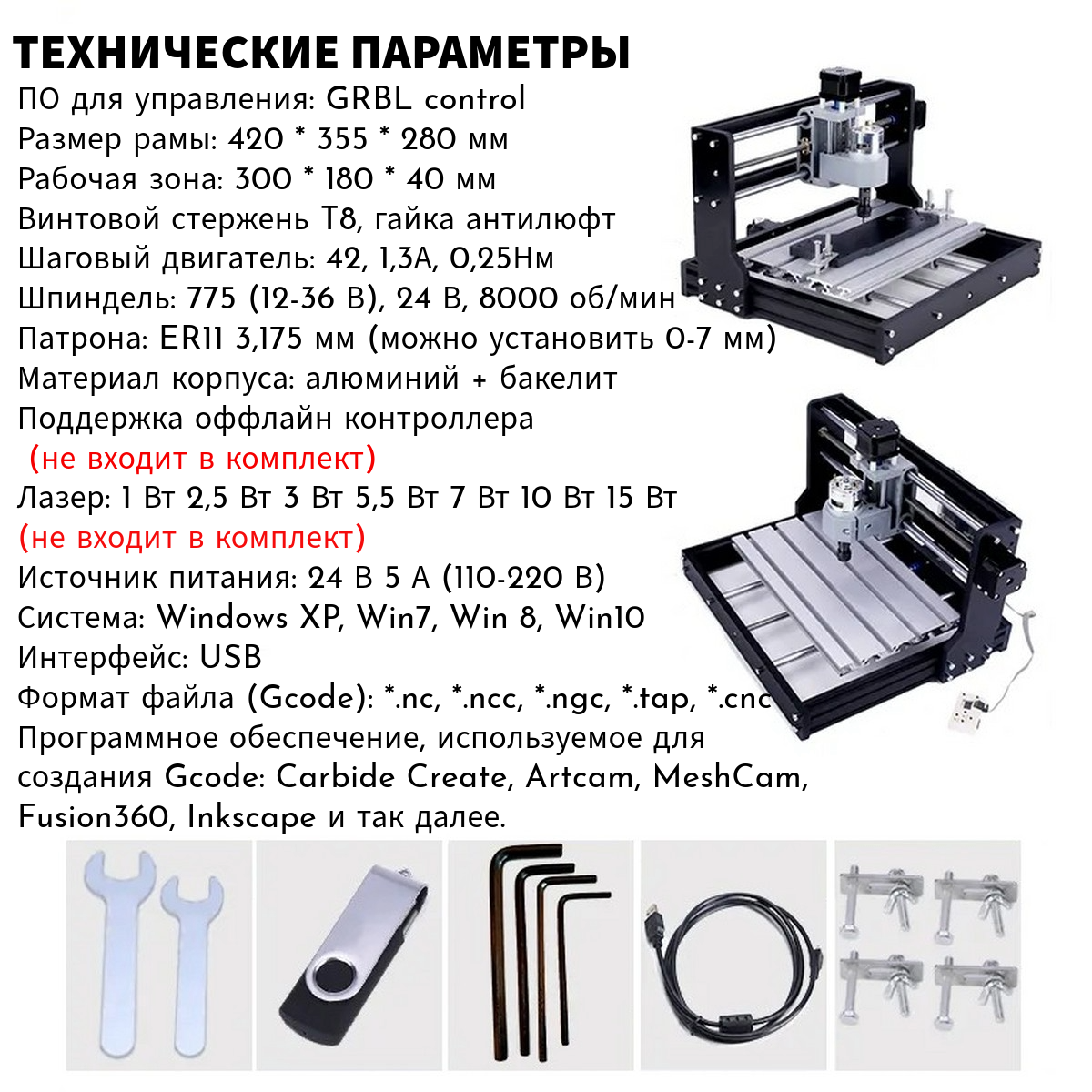 - Питание: 24 В, 5А - Рабочая область обработки изделий: 300 * 180 мм - Мощность шпинделя - 100 Вт - Материал станка: алюминий + пластик - Шаговый двигатель 1,3 А, 0,25 н/м - Шпиндель 775 ER11, 24В, 8000 об/мин - Двойной шарикоподшипник - Цанга 3,17 мм - Поддерживаемые системы: Windows XP / 7 / 8 / 10 - Управляющее программное обеспечение идет в комплекте на флэш-накопителе: Версия GRBL 1.1f (с открытым исходным кодом) - Подключение: USB - Импортированный формат файла (Gcode): *. nc, *. ncc, *. ngc, *. tap, *. cnc - Программное обеспечение, используемое для создания Gcode: Carbide Create, Artcam, MeshCam, Fusion360, Inkscape и др.